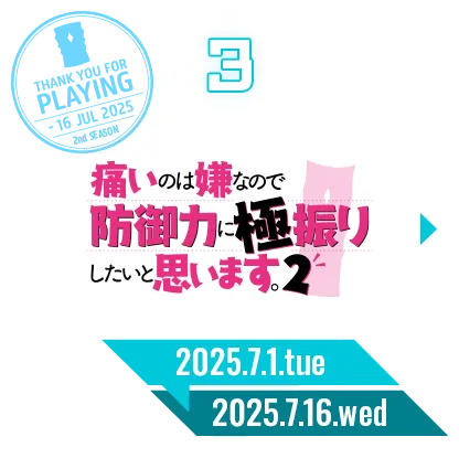 「2ndシーズン」第3弾、人気アニメ「痛いのは嫌なので防御力に極振りしたいと思います。2」とキャラが登場!